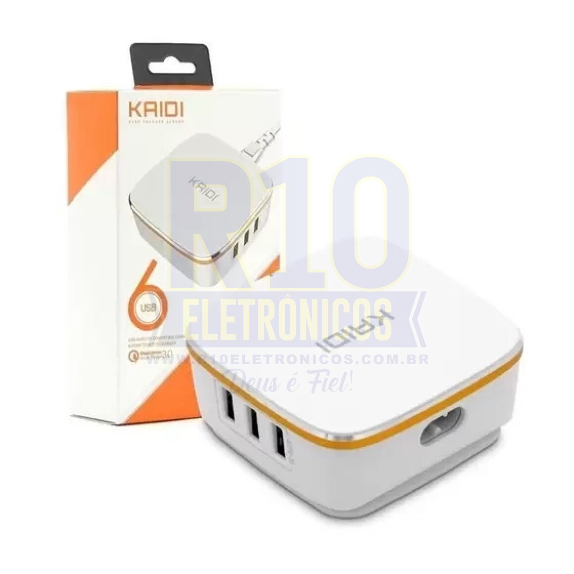 Hub Carregador turbo Marca Kaidi Modelo KD-601 Total de 6 portas USB 1 Porta USB 3.0 Qualcomm Quick Charge 3.0 5 Portas USB 2.0 Auto ID Cor branco com textura na parte superior Cabo tomada com 150 cm comprimento Output: 12V / 1.5A – 9V / 2A – 5V / 3A Input: Bivolt 100 – 240V