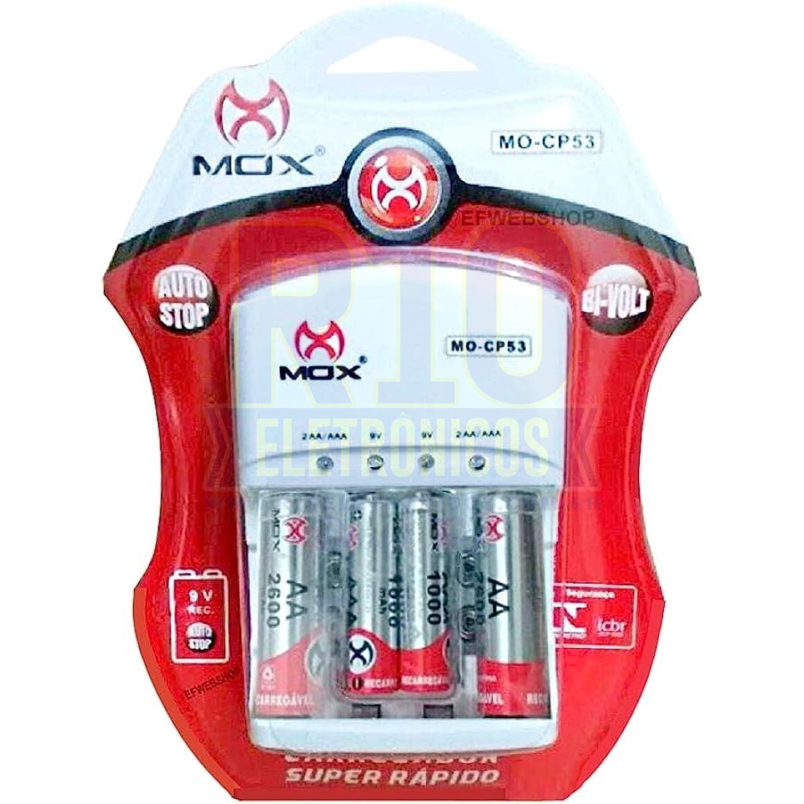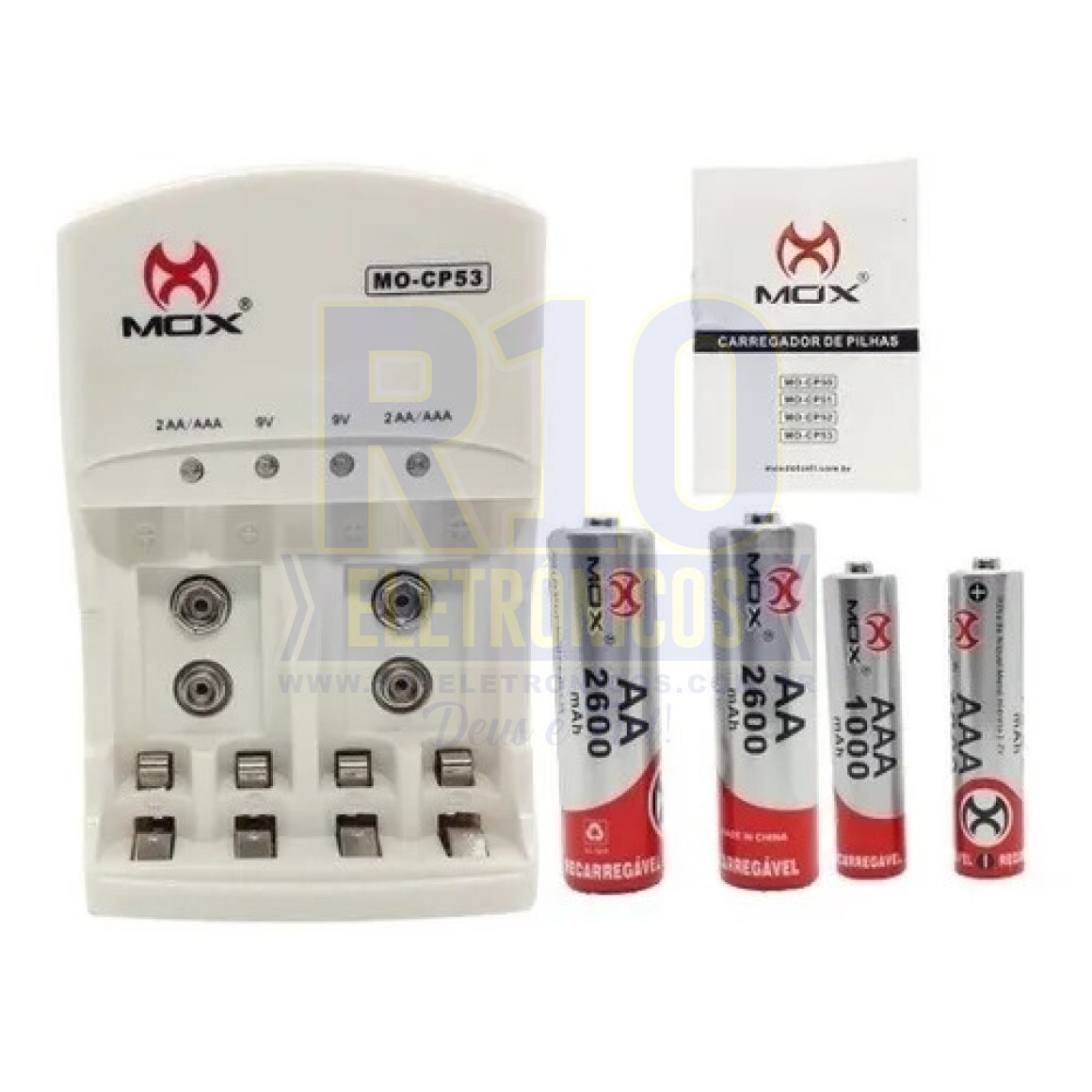 Carregador MO-CP53 Mais 2 Pilhas AA 2600mAh Pequenas e 2 Pilhas AAA Palitos 1000mAh Mox Recarregáveis Fabricante: MOX Modelo: MO-CP53Cor: Branco Pino de tomada retrátil Bi Volte Automático Auto Stop: Desliga Automaticamente quando a pilha carrega.