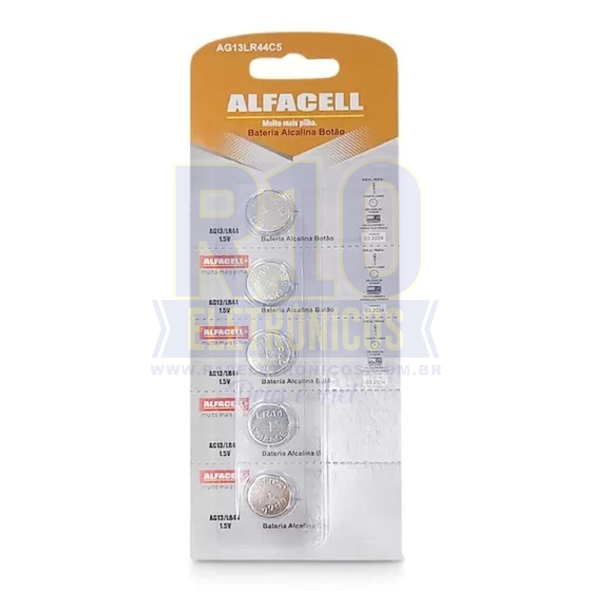 Bateria AG13 LR44 Botão Alfacell Alcalina Original Cartela Com 05 Unidades Bateria Alfacell AG13 LR44, cartela com 5 unidades. Geralmente utilizadas em calculadoras, relógios, instrumentos eletrônicos, controles automotivos e outros. Bateria de alta resistências e durabilidade. Qualidade garantida.