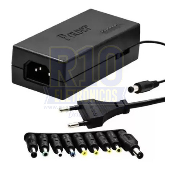 Fonte de alimentação para notebook com ajuste de voltagem, compatível com uma grande variedade de aparelhos notebook. Possui 9 plugues diferentes.