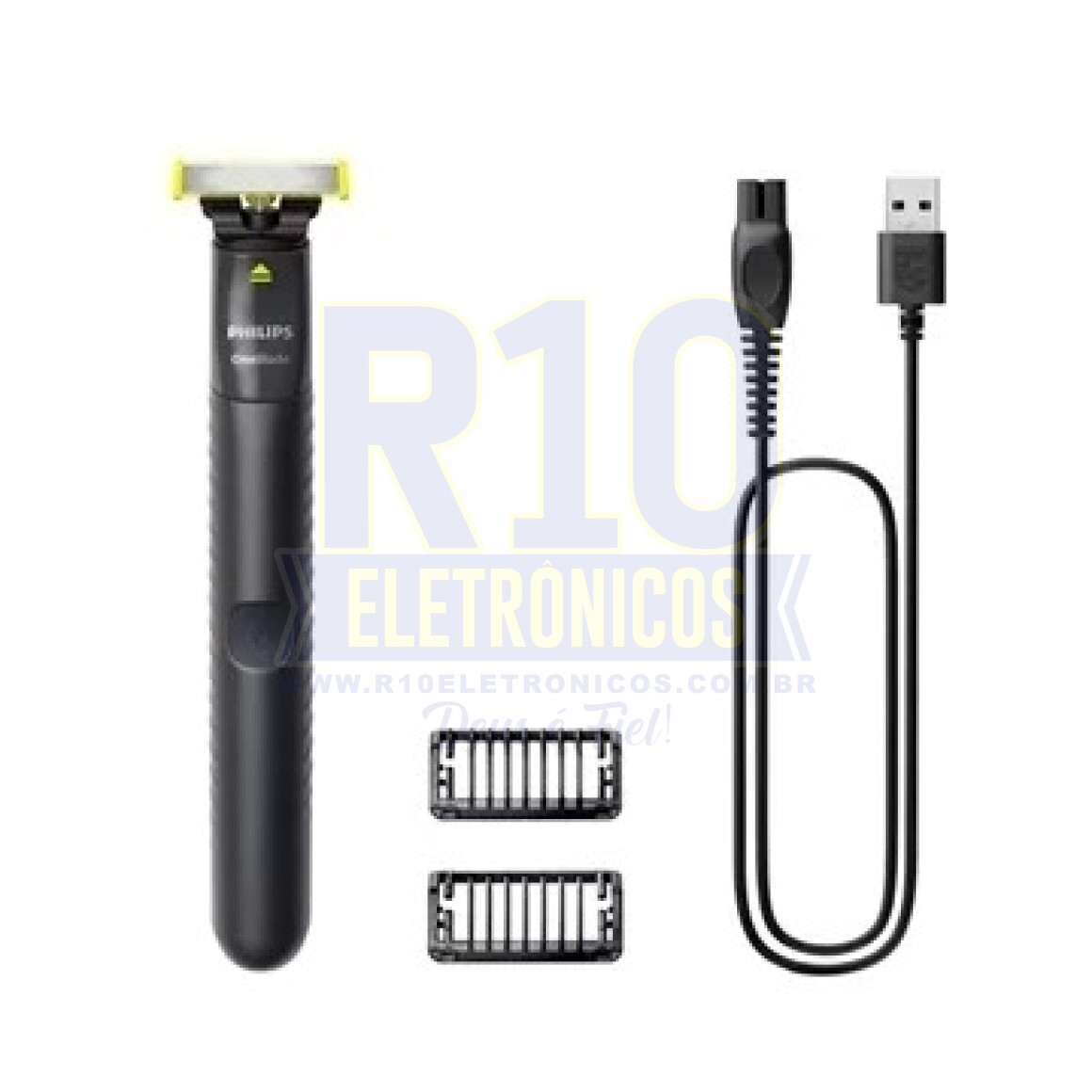 OneBlade QP1424/10 apara, modela e barbeia pelos de qualquer comprimento. Com o seu sistema de proteção dupla feito para cortar o pelo e não a pele, um revestimento para deslizar combinado com pontas arredondadas, torna o barbear mais simples e confortável. Possui 2 pentes para aparar e é completamente a prova d'água.
