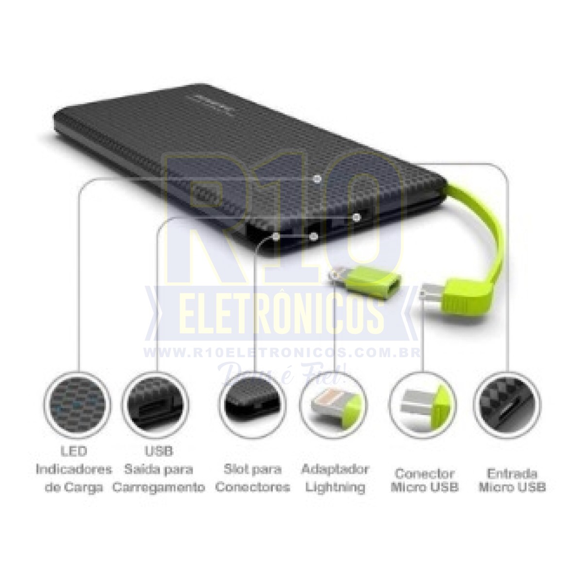 Input: 5 v 1 ASaída v 5: 1 1 ASaída 2: 5 v 2,1 ACom LED LanternaPeso: 9 ozConcha Material: ABS Com pintura PianoVida ciclo de carregamento: 500 taxasTempo de carregamento de banco de potência: aproximadamente 12hProteção para curto-circuito, sobrecarga, Underdischarge e preço adicionalVem Com cabo de USB para carregar o banco de potênciaBateria interna tipo: Li-Ploymer pilhas-Desligamento automáticoCE, FCC, RoHS aprovaçãoIncorporada Over-Chargealta proteção ICGestão de energia inteligente Micro-controlado