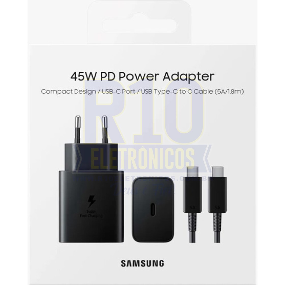 Carregamento super-rápido para uma ampla gama de dispositivos. Compatibilidade universal Seguro e estável também pode ser rápido e potente. A velocidade de carregamento pode variar de acordo com o dispositivo. ** O SFC 2.0 (45W) está disponível no Galaxy S20 Ultra, S22+ S22 Ultra, Note10+, Tab S7+ e versões mais recentes. Dispositivos compatíveis podem ser adicionados. Com o carregador de 45W, seu Galaxy fica com a carga completa super-rápido. Ganhe também um cabo extralongo prático de 1,8m na caixa. De fones de ouvido a tablets, carregue uma ampla gama de dispositivos em velocidades incríveis e aproveite o tempo de carregamento rápido para usar seus dispositivos. Seguro e estável também pode ser rápido e potente. Dê a seus dispositivos Galaxy a fonte de energia estável e segura que eles merecem. Em condições normais de uso, este carregador oferece proteção contra perigos como sobrecorrente, curtos-circuitos, variações de temperatura e muito mais.