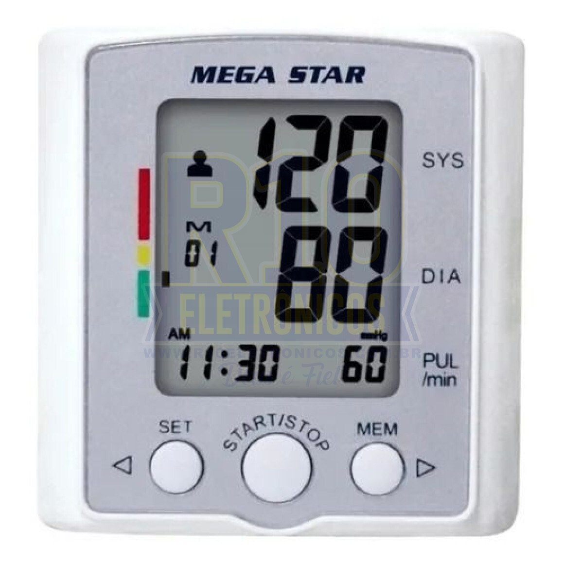 Display: LCD digital Método de medição: Oscilométrico Memória até: 120 funções Bateria: 2 pilhas AAA O Medidor de Pressão Digital Mega Star permite medir a pressão arterial do pulso no conforto da sua casa. Possui função de memória, detector de movimento de pulso e indicador de batimento cardíaco irregular. Além disso, possui uma grande tela LCD que mostra os resultados de forma clara e fácil.
