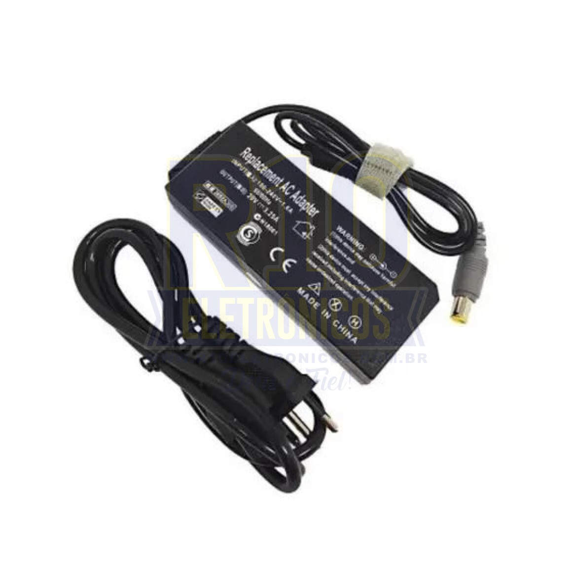 Fonte para notebook compatível com modelo Lenovo pino grosso. A fonte possui seleção de voltagem de alimentação automática (Bivolt 100-240V) e possui cabo de força incluso.