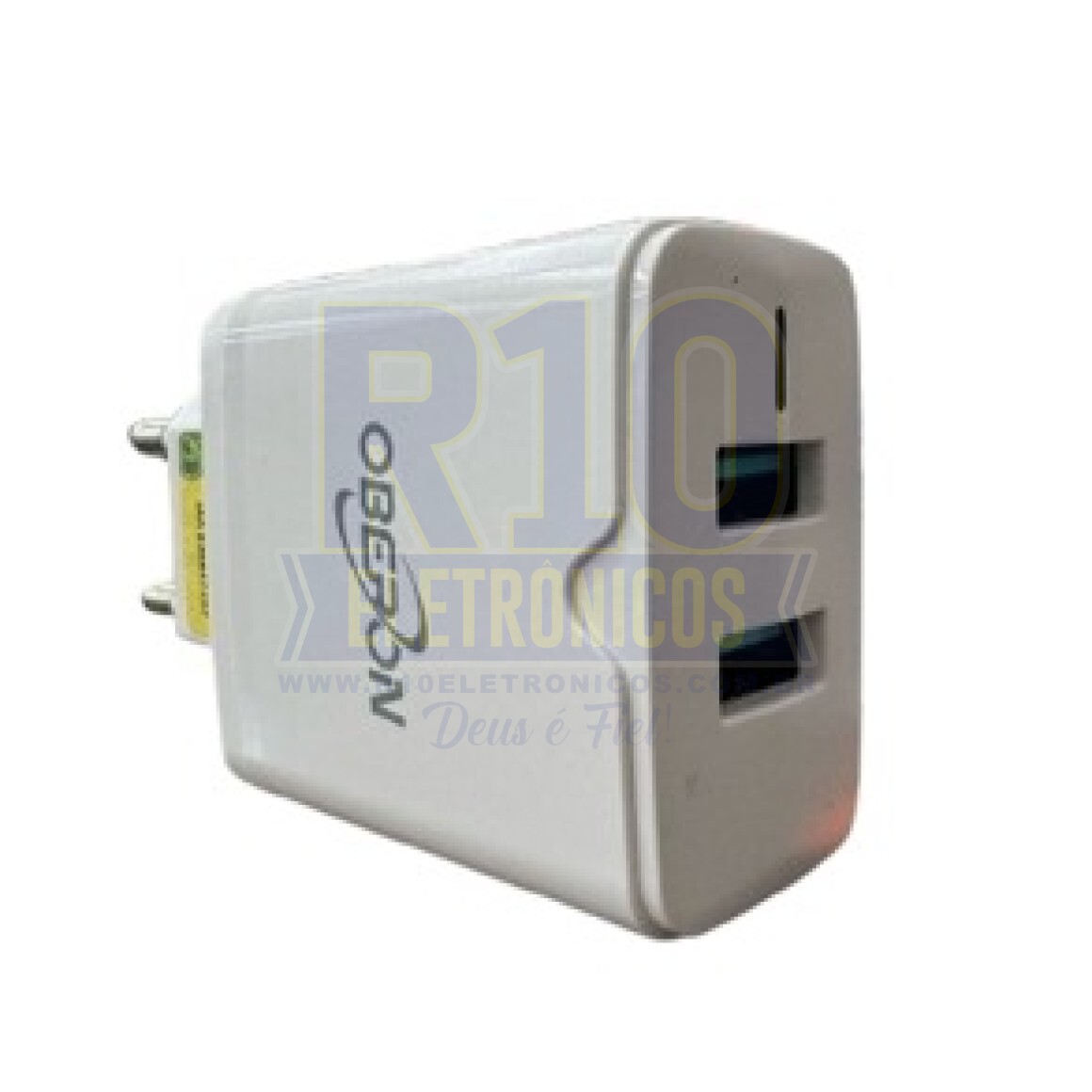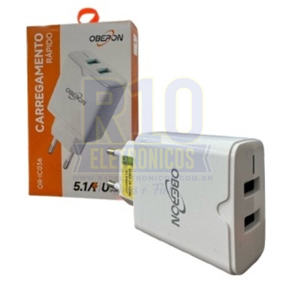 Especificações: Entrada: AC100-240V - 50/60Hz - 0,5A Material: ABS antichamas 2 Saídas USB-A: DC 5V/5,1A * Carga rápida 5,1A * 2 Portas USB Aceita cabos padrão Type-C, Micro USB e Lightning A Oberon, em sintonia com a necessidade de preservação do meio ambiente, declara que todos os itens que compõe este produto, desde sua embalagem até seus componentes e acessórios não contém metais pesados ou substâncias químicas nocivas ao ser humano e à natureza, e portanto são passíveis de reciclagem