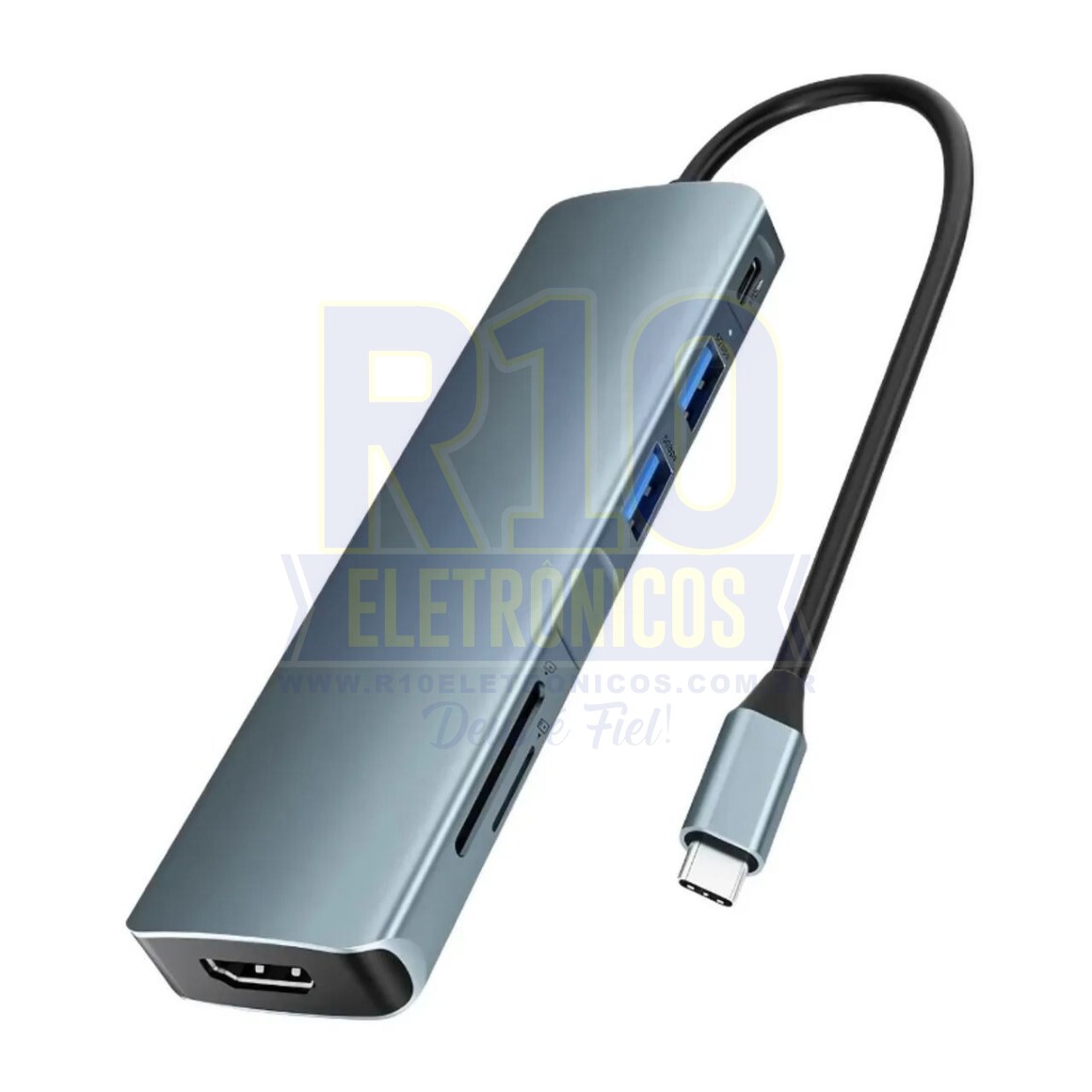 O HUB USB 6x1 é a solução perfeita para expandir as capacidades de conectividade do seu computador, Notebook ou Celular. Com um design compacto e elegante, este dispositivo oferece seis portas adicionais para que você possa conectar todos os seus dispositivos de forma rápida e eficiente.Especificações Técnicas:- Entrada Tipo C (Suporta modo VESA USB)- Saídas: 1xPD 3.0 / 1xHDMI 4K / 1xUSB 3.0 / 1xUSB 2.0 / 1xSD / 1xTF. 1 Porta PD: Porta de carregamento, suporta PD 3.0 a 60w. 1 Porta HDMI: HDMI com conector femea, capacidade 4K a 30Hz. 1 Porta USB 3.0: Conector 10x mais rápido que a porta USB 2.0. Compatível também com versões anteriores. 1 Porta USB 2.0: Conector com capacidade de transferência de 480Mbps. 2 Portas SD e TF: Conector de cartão, com capacidade de transferência de 480Mbps (OBS: Ele não suporta leitura simultânea, lê apenas o que for conectado primeiro.)- Cabo: Cabo com conector tipo C.- Plug and Play: Não necessita de instalação de drivers- Proteção: Proteção contra sobrecarga, sobretensão e curto-circuito- Compatibilidade: Windows Vista, 7, 8, 10, Linux, Mac OS 10/Superior.Cor: PrataMaterial: Metal / BorrachaCompatível com: Celular, Notebook, Ultrabooks, PCs e Vídeo Game.Uso Recomendado: Ideal para conectar dispositivos como teclados, mouses, impressoras, unidades de armazenamento externas, smartphones e tabletsVantagens:- Alta Velocidade: Transferência de dados super-rápida graças às portas USB 3.0.- Portabilidade: Design compacto e leve, fácil de transportar em bolsas e mochilas.- Facilidade de Uso: Plug and Play, sem complicações para instalação.- Segurança: Proteção integrada para segurança dos dispositivos conectados.Fique Atento! A percepção das cores nas fotos dos produtos podem variar de acordo com a configuração do seu monitor ou da tela do seu celular.Em caso de dúvidas, estamos a disposição.----------------Somos um dos maiores vendedores de acessórios para celular e relógios do mercado digital. Buscamos proporcionar uma experiência de compra única, levando até você um produto de qualidade, com o melhor atendimento e o melhor preço. Oferecemos suporte a qualquer dúvida ou problema que possa ocorrer.