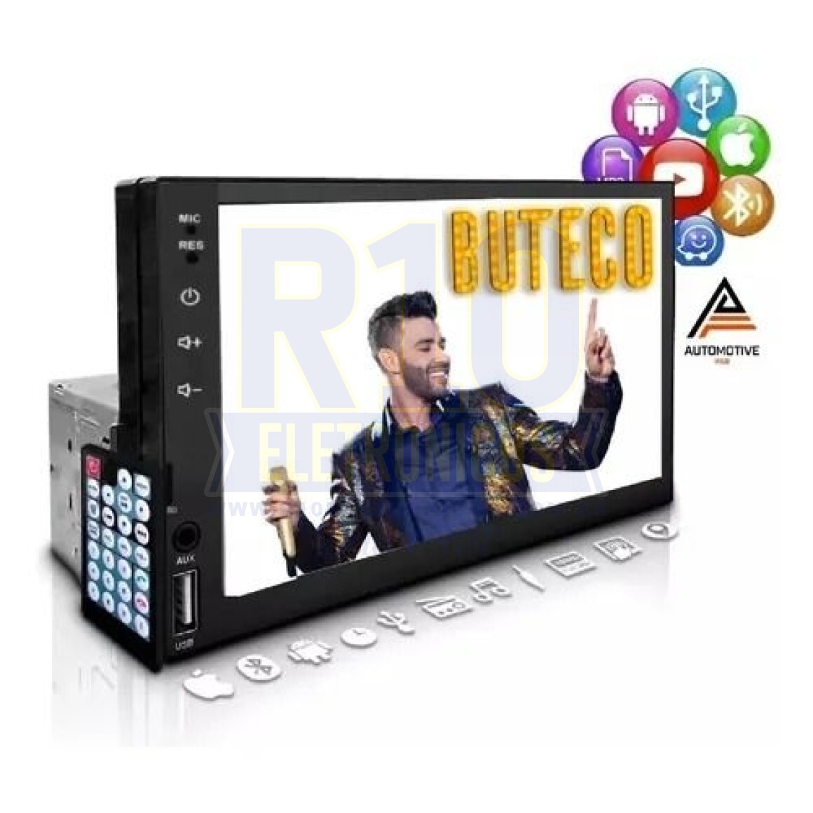 Unidades por kit: 1 Formato de venda: Unidade Com porta USB e leitor de cartão SD. Tecnologia Bluetooth incluída. Inclui controle remoto. Equalizador de bandas incorporado. Dimensões: 5.5 cm de largura, 18 cm de altura e 11 cm de profundidade. CARACTERÍSTICAS: Cor: Preto; Modelo: RA915; Marca: Knup; Tela 7 Polegadas Digital TFT Touch Screen; Formato de vídeo 1080P; Entrada USB, SD, Cabo Auxiliar e Câmera de ré; Formato de áudio: MP3/WMA/WAV/FLAC/OGG/APE; Formato de vídeo: RM/ RMVB/ DVD(VOB)/ VCD(DAT)/ MP1/ MP2/ DIVX/ XVID/ MP4/H264/ FLV/ 3GP/SWF/ AVI/ ASF/ MJPEG, etc; Potência de saída: 60x4; Rádio FM; Espelhamento via cabo USB Android e IOS;