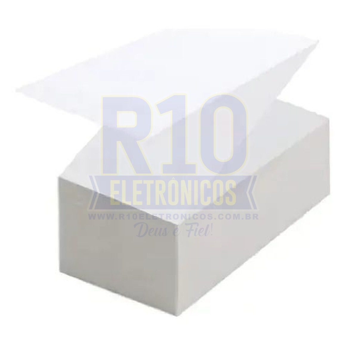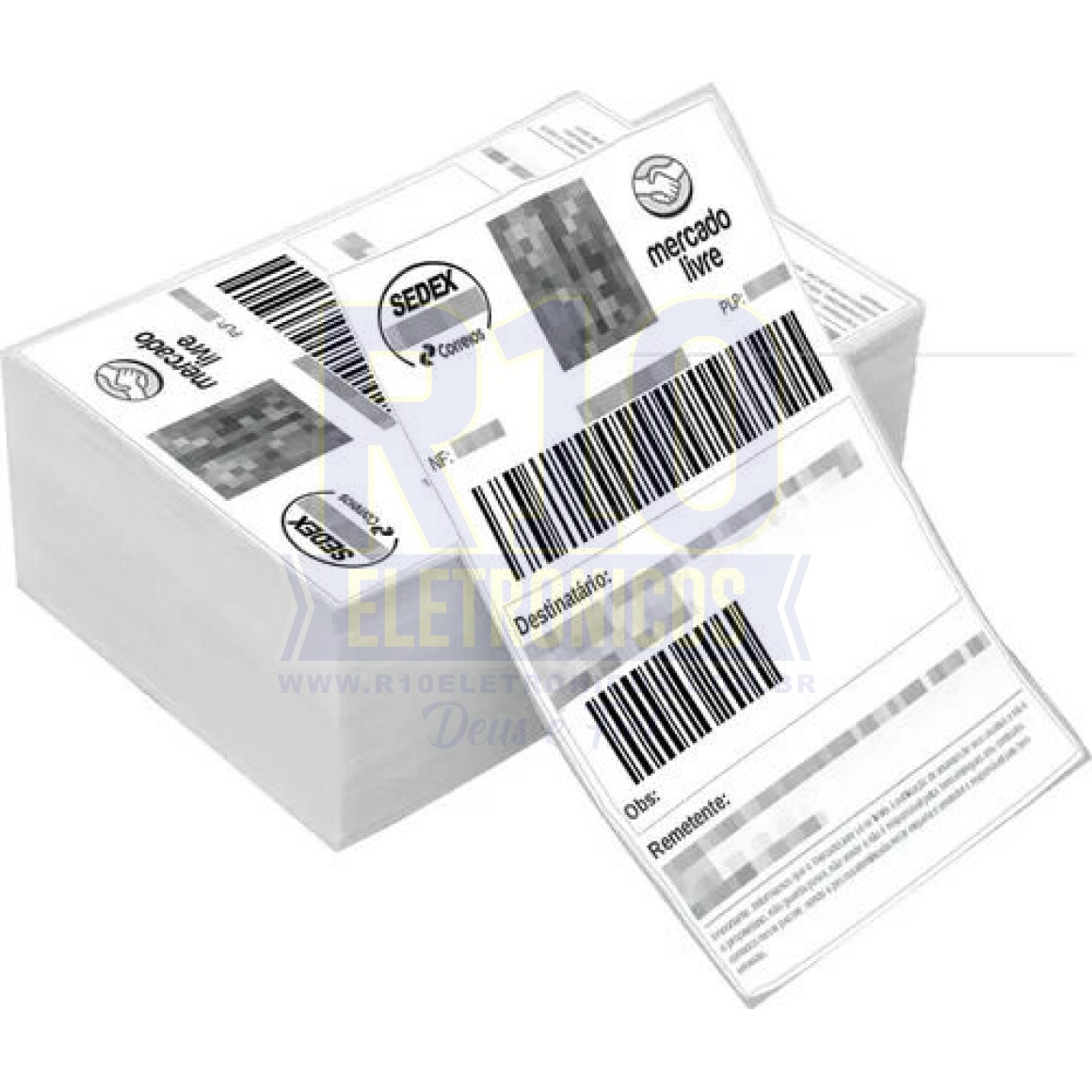 tiqueta adesiva de papel térmico com dimensões de 10x15 cm (100x150 mm). Não requer ribbon para impressão. Microserrilha entre etiquetas facilita o destaque.