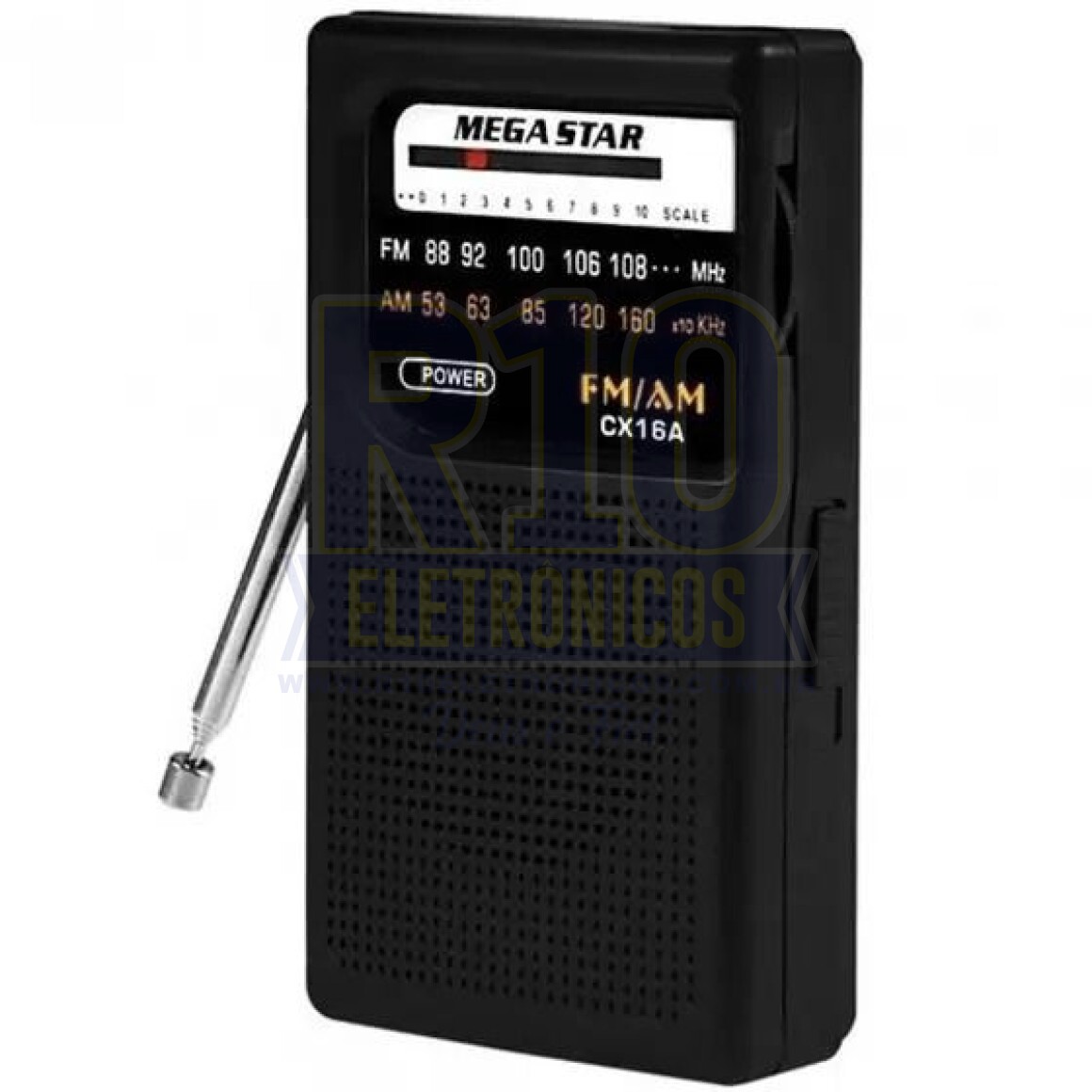 O Rádio Portátil Mega Star CX16A com alto-falante de 57 mm, está equipado com potência máxima de 0.5 para reproduzir com nitidez diferentes estilos musicais. Dispõe de antena retrátil para ampliar o alcance de busca do sinal e melhorar a estabilidade de conexão com as estações AM e FM disponíveis na região. Além disso, possui interface Mini Jack 3.5mm para conectar fones de ouvido e acompanhar as principais notícias do dia e desfrutar das emissoras de rádio favoritas com maior privacidade. É leve e possui design compacto, que permite transportá-lo a passeios ou compromissos do dia a dia sem ocupar muito espaço em bolsas ou mochilas. Está equipado com 0.5 watts de potência que proporciona sonoridade com nitidez para diferentes estilos musicais. Sintoniza estações de Rádio AM e FM, que além de reproduzir diferentes gêneros musicais, também está sempre atualizando o ouvinte com as principais notícias do dia a dia. Versátil, possui alça de pulso integrada, com a qual é possível transportar com maior facilidade, ou utilizá-la para suspendê-lo em paredes ou suportes