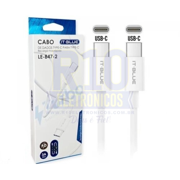 Cabo de dados branco type c x type c 1 metro it-blue le-847 - IT BLUE Cabo marca It-Blue com carregamento ultra turbo e transferência de Dados. Produto com chip original Samsung para não ter problemas com reconhecimento, cabo bem estruturado, e com suporte para os novos carregadores saídas usb-c tipo-c. Produto está pronta entrega. Marca: It-Blue Modelo: Le-847 Potência: 3A à 60W Entrada: usb-c tipo-c Saída: usb-c tipo-c Tamanho: 1M Compatibilidade: Android Tipo de Cabo: Carregamento com transferência de Dados.