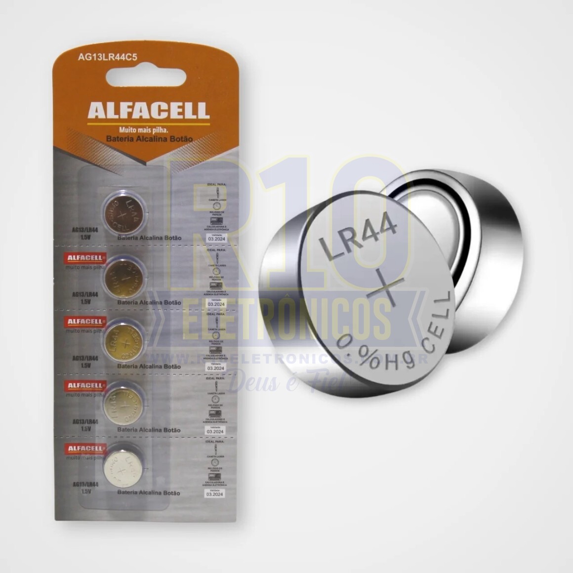 Bateria AG13 LR44 Botão Alfacell Alcalina Original Cartela Com 05 Unidades Bateria Alfacell AG13 LR44, cartela com 5 unidades. Geralmente utilizadas em calculadoras, relógios, instrumentos eletrônicos, controles automotivos e outros. Bateria de alta resistências e durabilidade. Qualidade garantida.