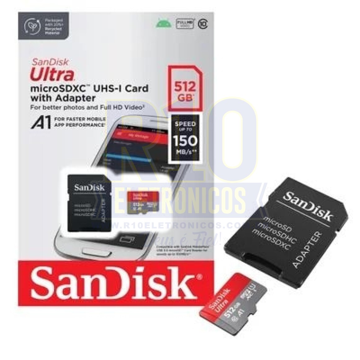 Com velocidade de leitura de até 150MB/s, o Cartão SD SanDisk Ultra C10 oferece 512GB de armazenamento destinado a armazenamento de documentos, arquivos, fotos e gravação de vídeos em Full HD, junto de adaptador SD compatível com câmeras digitais e possui resistência prova de choque, temperatura, água e à prova de raios-X.