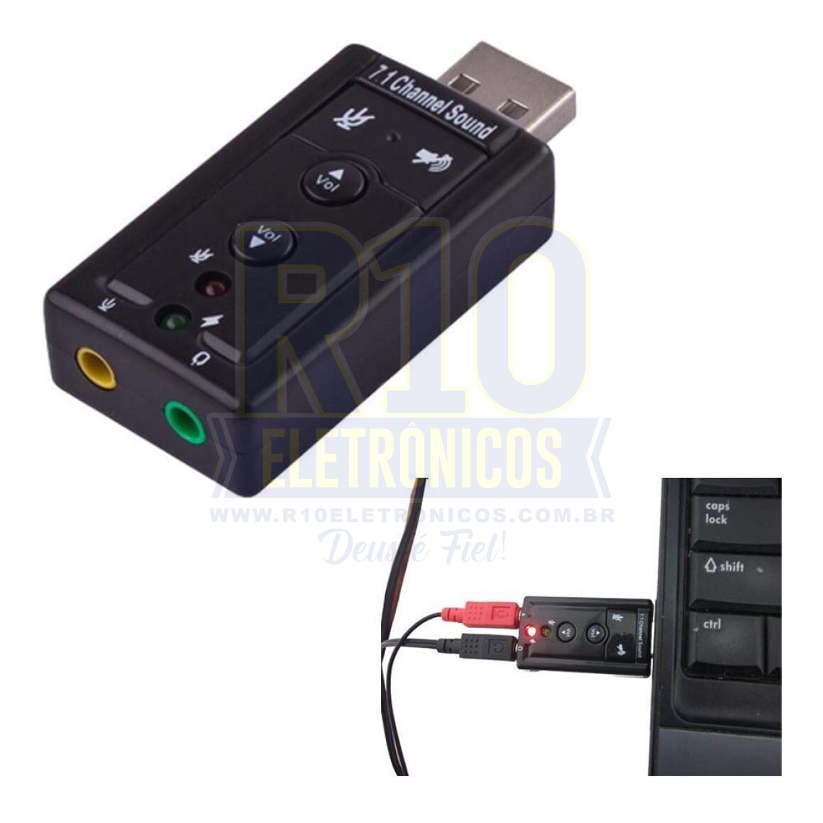 Este é um adaptador de áudio USB 2.0 externo com simulaçao 3D de 7.1 canais,Pode ser usado em desktops e notebooks proporcionando alta fidelidade sonora,Adaptador USB 2.0 Externo 7.1-Canais,Compatível com USB 2.0 Full Speed (12Mb/s),Totalmente Plug-and-Play, basta conectar e começar a usar,Som de altíssima qualidade,Amplie seu alto-falante ou fone de ouvido estéreo com 7.1 canais surround,Led indicador de funcionamento,Alimentado diretamente via USB,Funciona com qualquer desktop ou notebook.