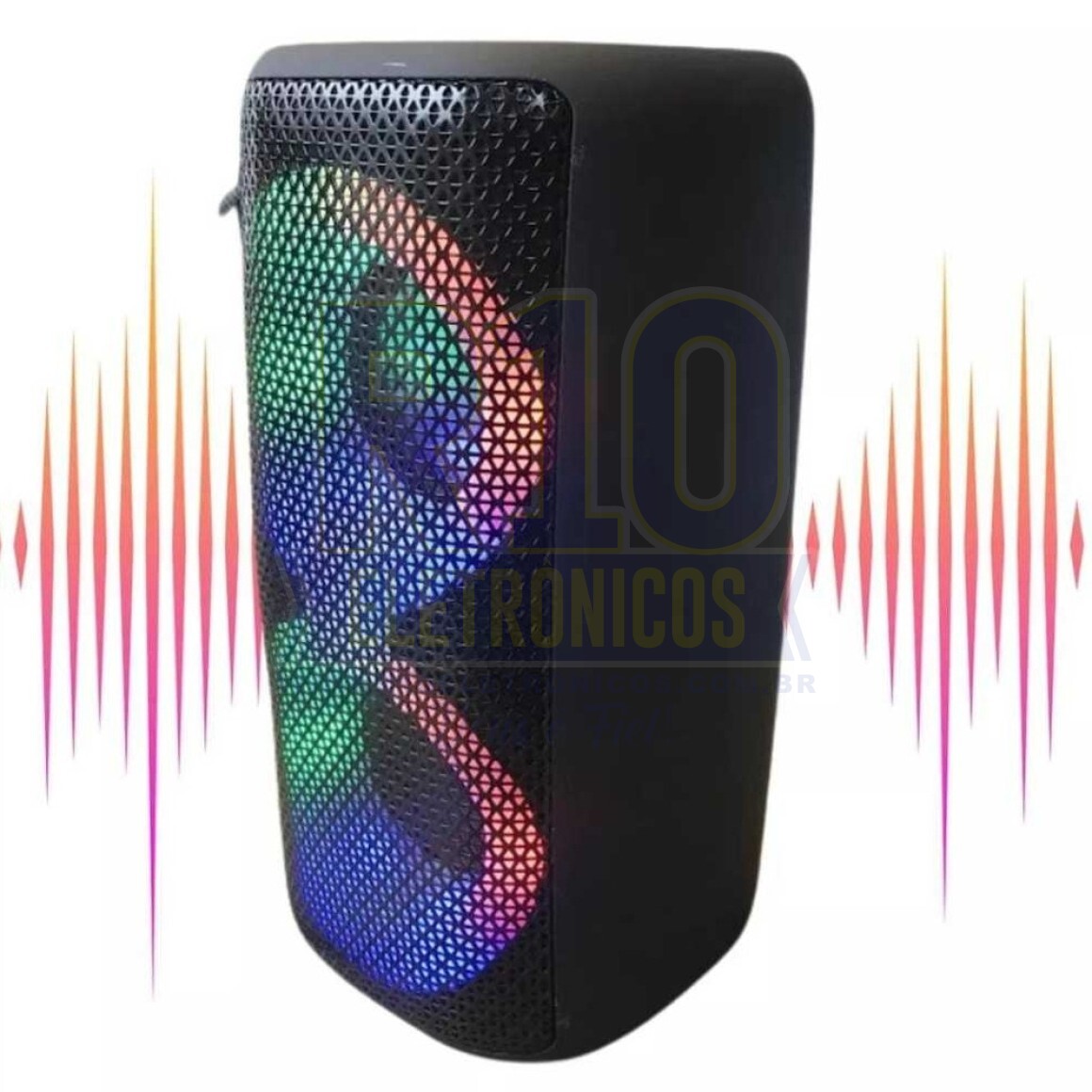 Conectividade Total: Tecnologia TWS para emparelhamento com outras caixas de som, microfone, rádio FM, entrada AUX e suporte a cartão micro SD.