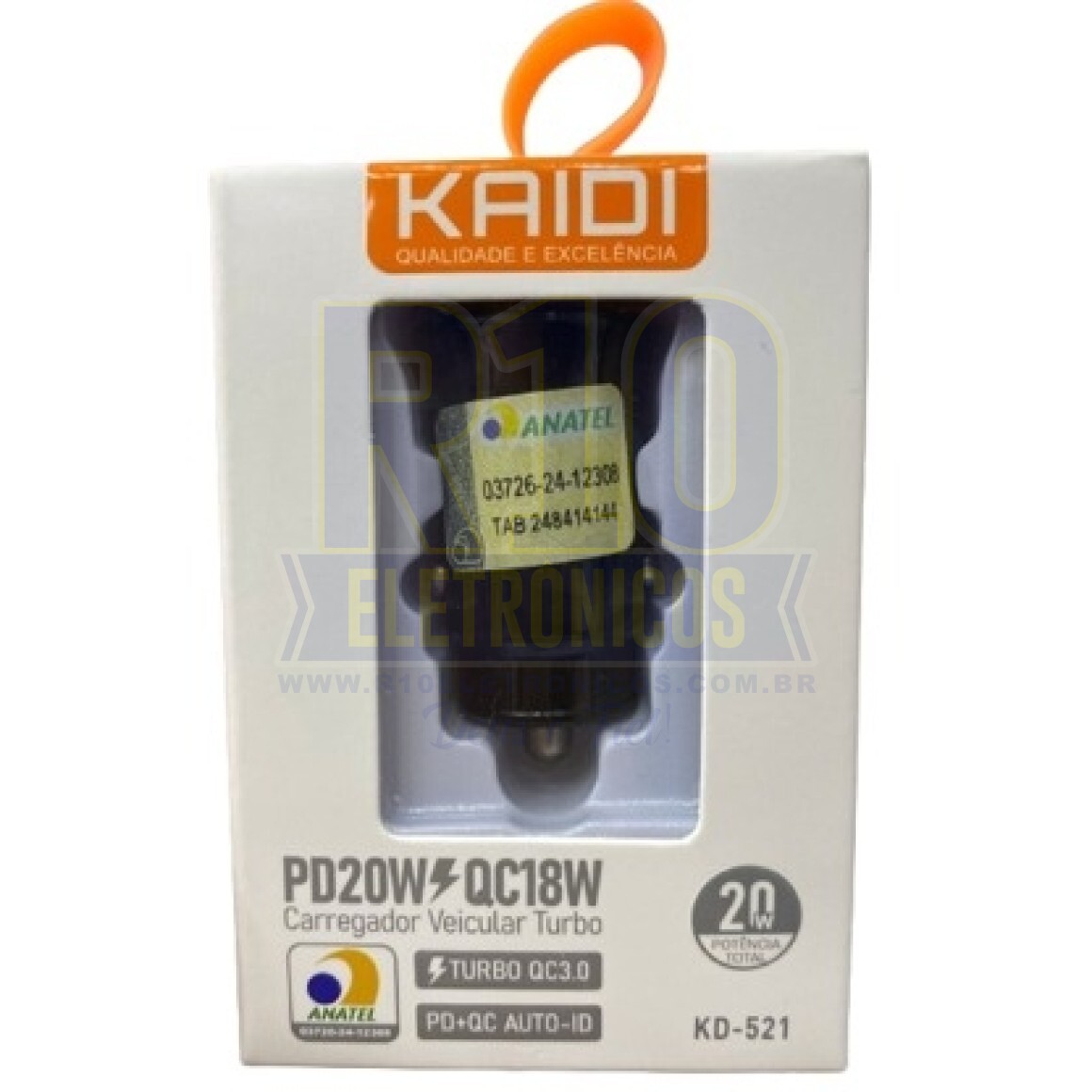 FONTE USB VEICULAR KAIDI KD-521 20W PD20W QC18W TIPO-C