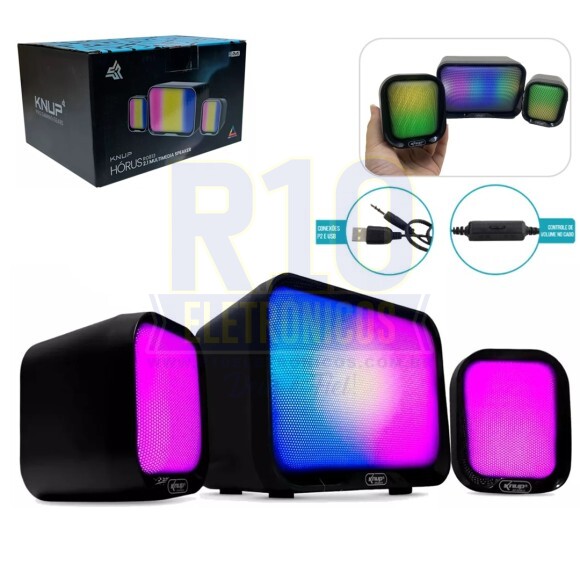 Caixa de Som Multimídia Hórus 16W Knup KP-RO813 - Com controle de volume - Iluminação LED - Conexão de áudio P2 3,5mm - Ideal para músicas, filmes, jogos, etc... - Compatível com WIndows, Mac e Linux - Potência: 16W RMS - Frequência: 20Hz - 20kHz - Sensibilidade: 70dB - Impedância: 4ohms - Alimentação: 5Vdc (via porta USB