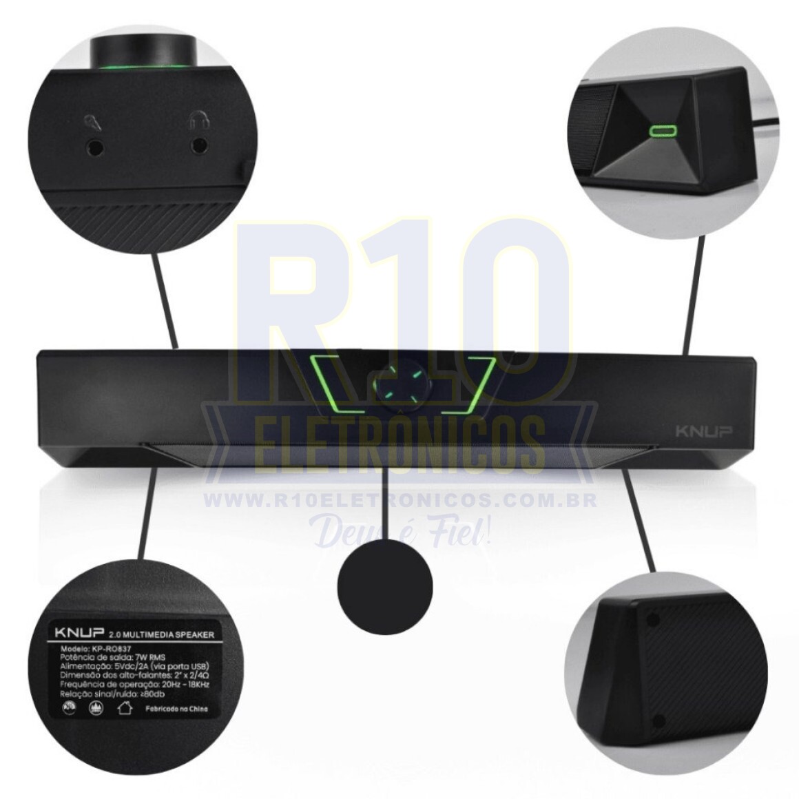 Potência: 7W RMS; Alimentação: 5Vdc/2A (Via USB); Resposta de frequência: 20Hz - 18KHz; Sensibilidade: 80dB; Dimensões: 40 x 6,5 x 8 cm (C x L x A); Iluminação em LED; Com controle de volume; Compatível com PC e Notebook;