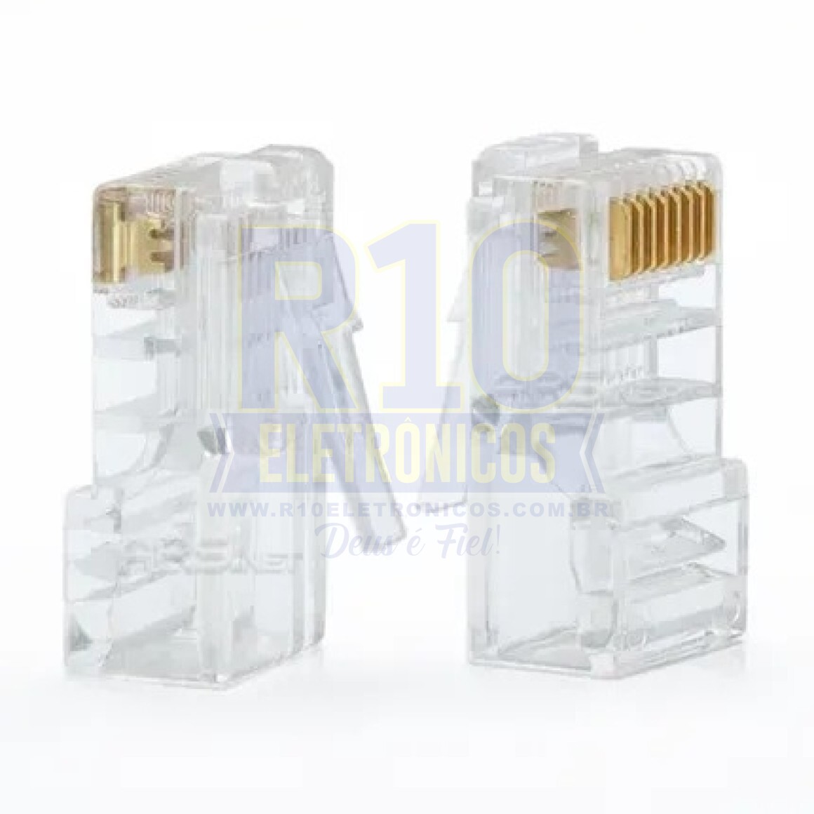 O conector RJ45 foi confeccionado com material ecológico, possui revestimento transparente e onta com condutores banhados a ouro, para maior vida útil de sua instalação de cabos de rede e segurança no tráfego de informações.