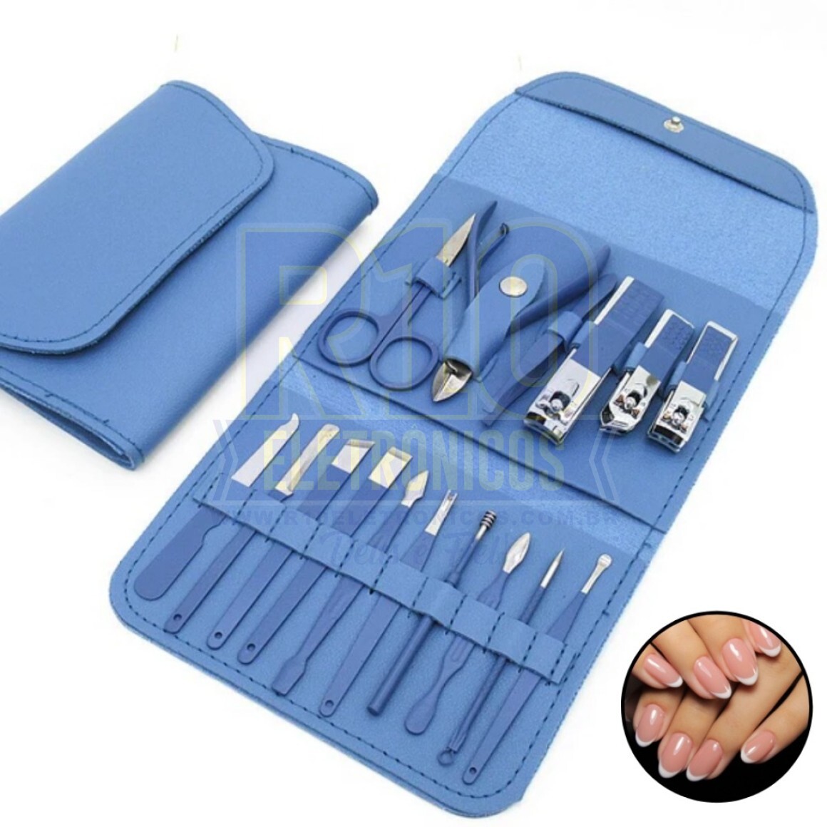 Descrição: Kit manicure 16 peças em estojo de couro sintético estilo envelope, contém: tesoura, alicate de cutícula, pinça, 3 cortadores de unha, lixa, 2 bisturis, raspador, empurrador de cutícula, removedor de cutícula, espátula dupla para limpeza das unhas, limpador de ouvido, palito de unha e espátula para ouvido.