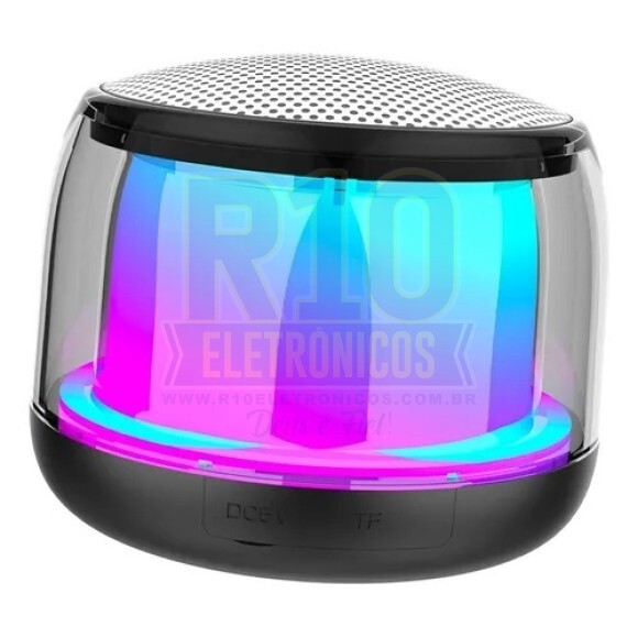 Tipo de alto-falante: subwoofer. Possui conectividade Bluetooth. Possui luzes LED. Bateria recarregável. Potência de 3W. Lugar de colocação: o piso. Tempo de carga da bateria: 2h