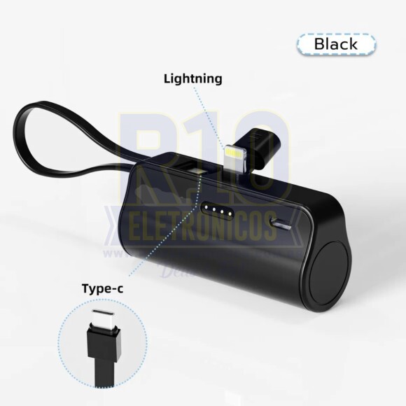 Sua capacidade de 5000mAh é ideal para dar uma carga completa em smartphones e dispositivos eletrônicos de forma prática. O modelo é equipado com duas saídas: Lightning com corrente de 3A, ideal para dispositivos Apple, e USB-C com potência de 22.5W, proporcionando recarga ultrarrápida.