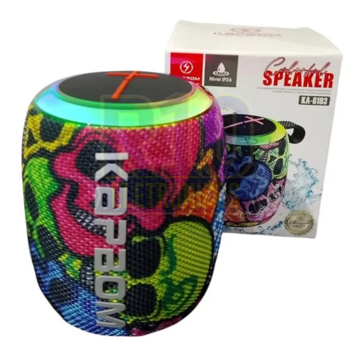 Características: Caixa de Som Bluetooth Recarregável Luzes LED Portátil Espaço para cartão TF - Chamada de voz Espaço para cartão USB Rádio FM - 5 Modos de luz Especificações: Potência: 7W RMS Tipo de bateria: polímero de lítio 1200mAh Resposta da frequência: 85Hz-15Kh Versão: 5.1 Tempo de jogo: até 8 horas Tempo de recarga da bateria: 2 horas IPX6: respingos e gotas de água resistentes