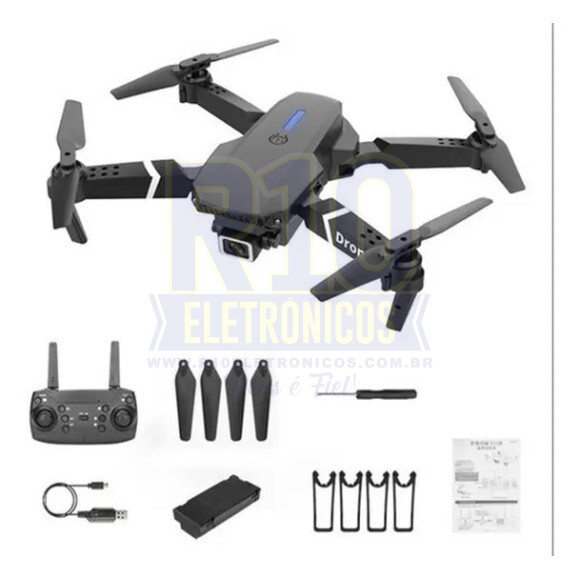 Acompanha o Drone 2 baterias, Também acompanha Case, controle, carregador e hélices reservas, além de protetor de hélice,E88 pro mini O MAIS pratico, dinâmico e fácil de pilotar com sua camera dupla wifi fpv e modo headless formato dobrável, otimo para iniciantes ou adeptos de drones , se surpreenda com este magnifico quadricoptero..........ATENÇÃO produto com estoque no brasil e envio imediato....Características- Sensor de desvio de obstáculos de três lados, ele pode detectar automaticamente objetos e ficar longe para evitar colisões desnecessárias com seu drone.- Braços dobráveis, tamanho pequeno, fácil de transportar.- Função de modo de espera de altitude fornece vôo estável.- Função wi-fi pode ser conectado app, sistema apk para tirar fotos, vídeo, transmissão em tempo real através da imagem da câmera do telefone.- 2 câmeras , grande angular e ampla para alta definição de imagens e vídeos.- Modo sem cabeça, não há necessidade de ajustar a posição da aeronave antes de voar.-Trajetória de vôo. Desenhe uma maneira fligh na tela, e o drone conduz um vôo autônomo ao longo do caminho designado.-Tecnologia 2.4ghz adotada para anti-interferência.- 4 canais que pode fazer ascendente, descer, para a frente, para trás, mosca lateral esquerda, mosca lateral direita e rolando 360 °.- Giroscópio de 6 eixos que pode ter um vôo mais estável e ser fácil de controlar.- 3 níveis de velocidade de vôo para alternar que pode fazer mais divertido o vôo.- A fuselagem quadcopter é feita de plásticos de engenharia de grande resistência, leve e durável.Funções- Para cima/para baixo, para a frente/para trás, vire à esquerda/direita, vôo sideward, velocidade de vôo de 3 níveis, luz led, modo sem cabeça, modo de espera de altitude, wifi fpv, vôo de trajetória, 2 câmeras de VídeoMatéria- Código do item: E88pro- Freqüência: 2.4G- Canal: 4CH- Motor: 816 motor coreless- Quadcopter bateria: 3.7v 1800mah lipo (inclusa)- Bateria do transmissor: 3x1.5 aa bateria (não inclusas)- Tempo de vôo: 15 minutos- Tempo de carregamento: 100 minutos- Distância r/c: cerca de 80-100m- Distância do tempo real da imagem de wifi: aproximadamente 20-30m- Cor: Preto- Câmera: 1080p- Pixel da foto: 4096*2160p- Pixel de vídeo: 2560*1440p- Tamanho do quadrilátero: 25*20*5.5 cm (os braços não dobrados)- 12.5*8*5.5 cm (os braços dobrados)Pacote Inclui:1 E88pro rc quadcopter1 Controle Remoto2 Baterias1 Cabo de carregamento usb4 Tampas de Proteção4 Lâminas De Reposição