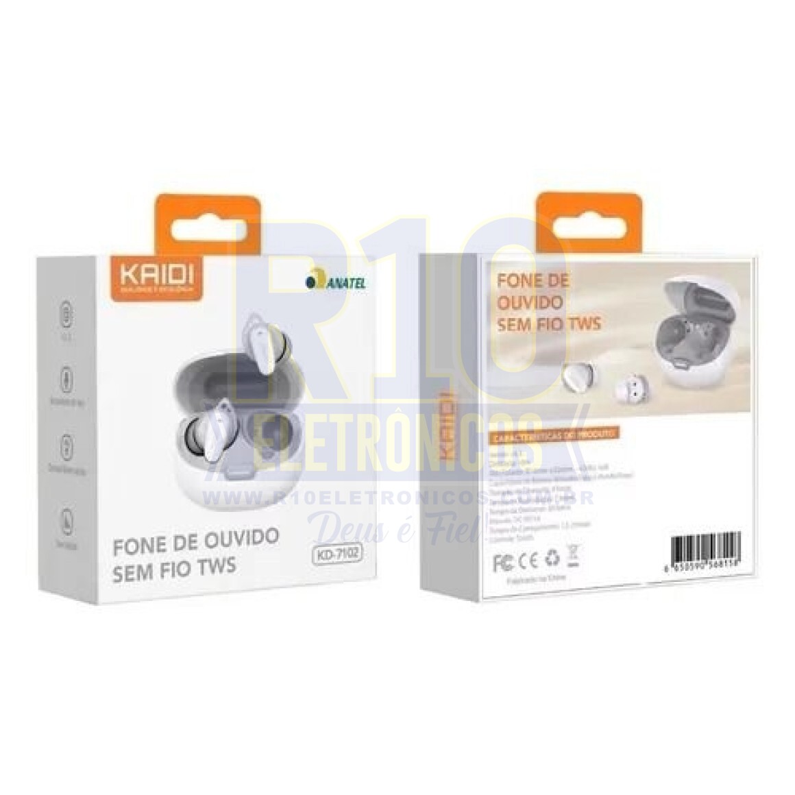 Quantidade de pares: 1 Possui tecnologia True Wireless. Com estojo de carregamento. Inclui microfone. Descrição: Fone de Ouvido Sem fio Bluetooth TWS Kaidi KD-7102 tem versão TWS 5.3 com baixa latência e alta estabilidade. Utiliza-se uma nova geração de chips inteligentes, com função Smart Touch, além de ser resistente à água no nível IPX4. - Smart Touch - Design Minimalista - Design ergonômico confortável - Bateria de alta durabilidade - Qualidade de som nítido Especificações: - Especificação da versão: V 5.3 - Protocolo de suporte: HSP, HPF, A2DP, AVRCP - Tempo de repouso: 30h - Tempo de reprodução: +/-7h - Tempo de conversação: +/-4h - Tempo de carregamento: 2h - Faixa de frequência: 2.400 - 2.485GHZ - Distância de transmissão < 10m - Capacidade da bateria: 3.7V/40mAh cada fone - Capacidade da bateria do estojo: 3.7V/400mAh