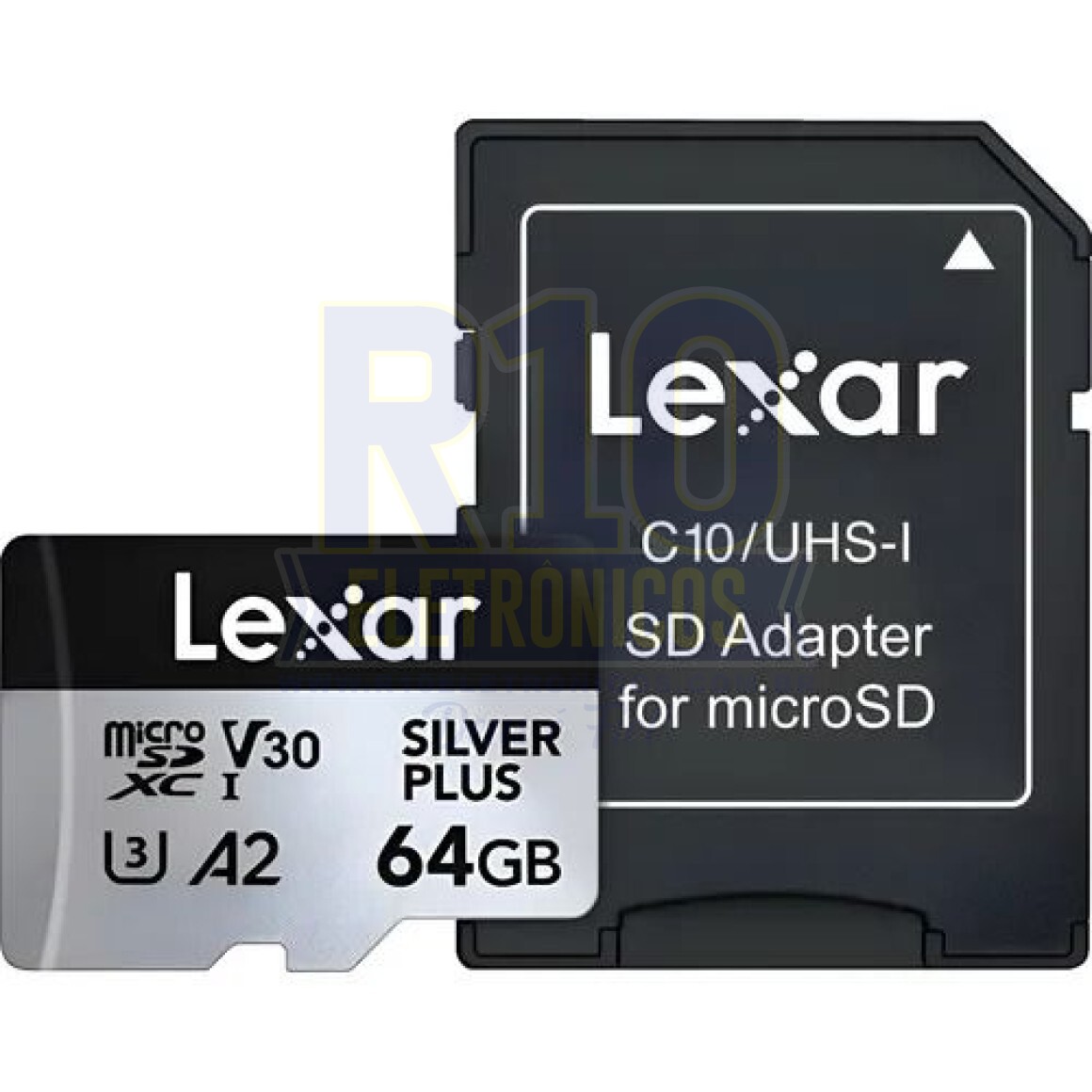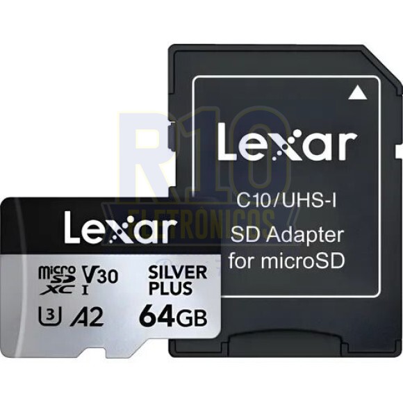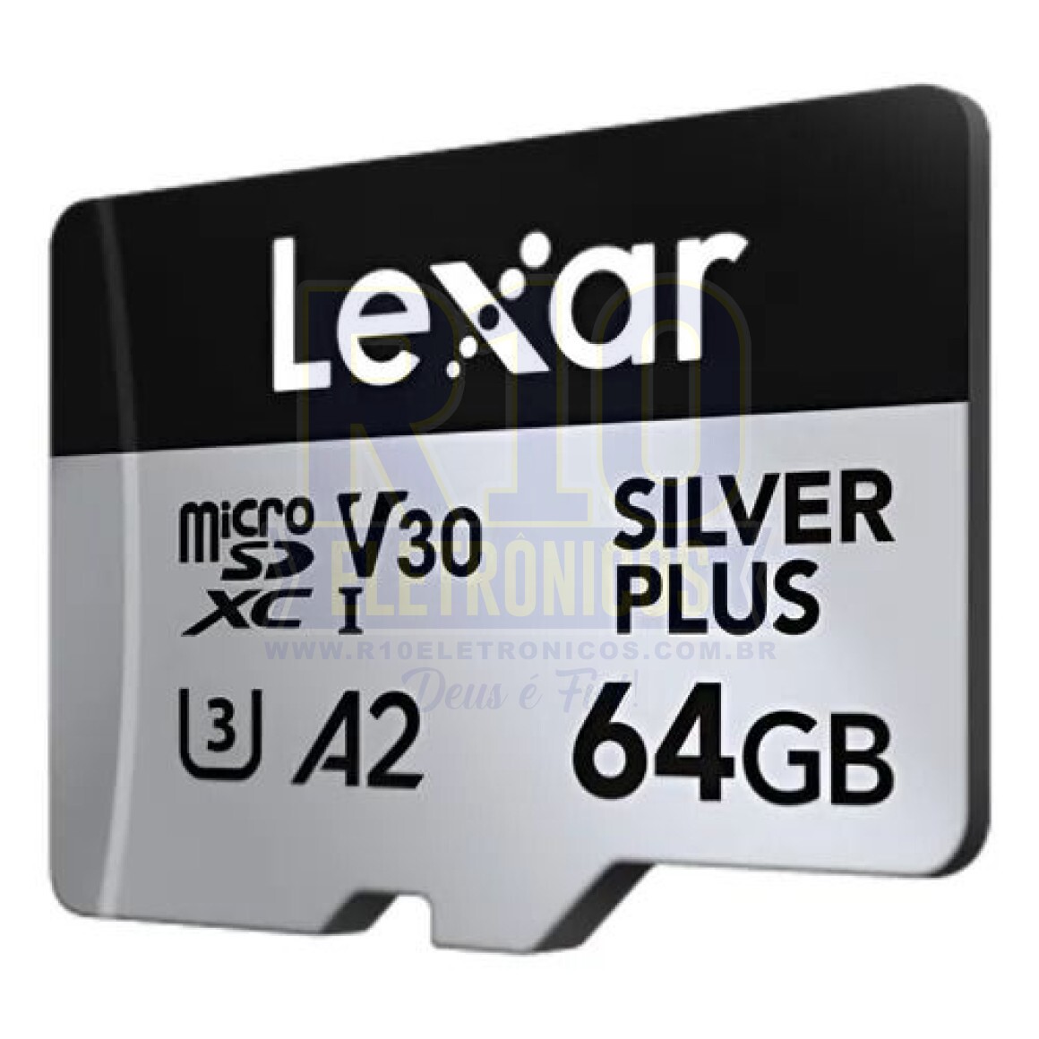 O Cartão MicroSDXC 64Gb Lexar Silver Plus Profissional 4K 205Mb/s UHS-I V30 U3 A2 Classe 10 com Adaptador SD (LMSSIPL064G-BNANG) possui capacidade de armazenamento de 64 GB e utiliza o barramento UHS-I para suportar vídeos Full HD e 4K/60p. Também é ideal para disparos contínuos, disparos rápidos e capturas em RAW e JPEG. Este Cartão Micro SDXC Lexar Silver Plus Profissional pode atingir velocidades máximas de leitura de até 205 MB/s e velocidades máximas de gravação de até 100 MB/s. Graças à sua classificação de velocidade V30, as velocidades mínimas de gravação são garantidas para não cair abaixo de 30 MB/s.