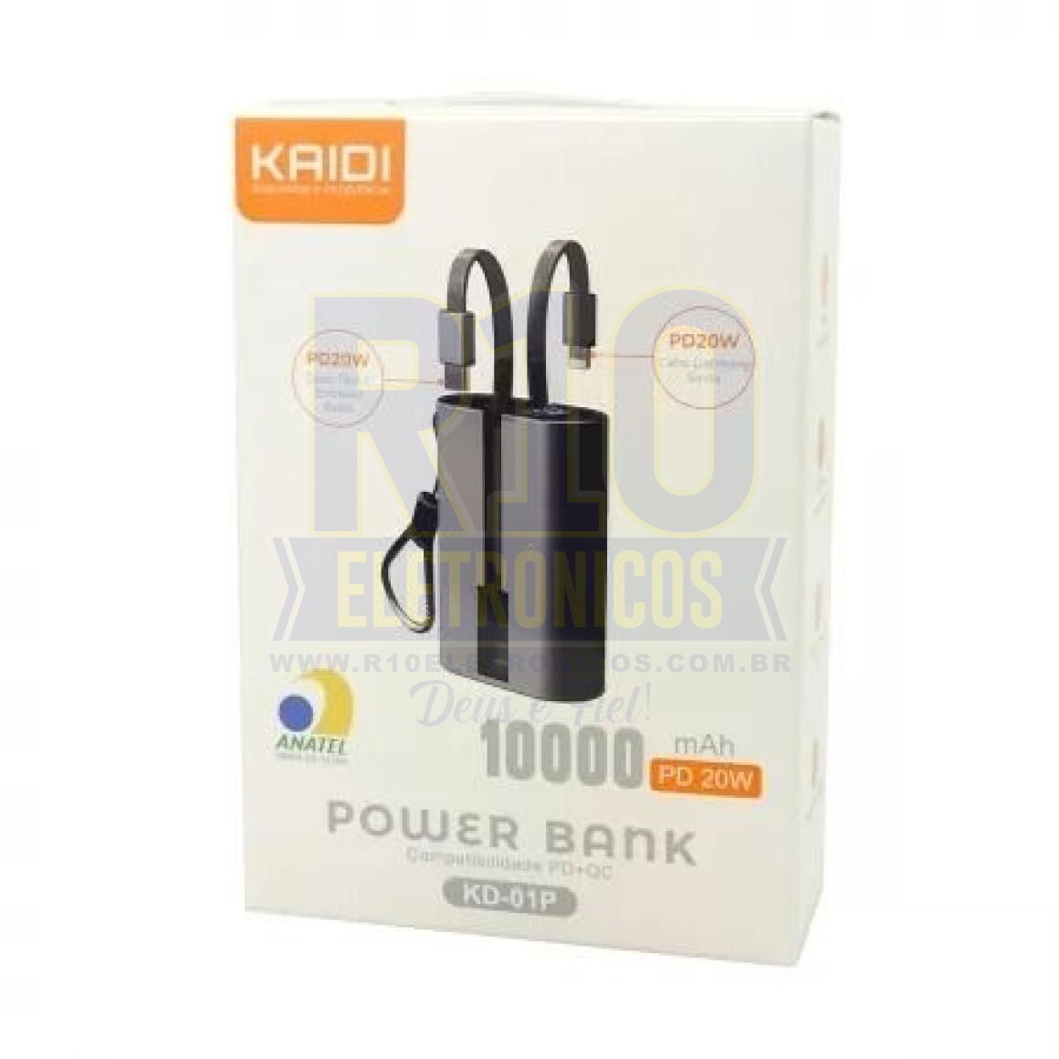 Power Bank da marca Kaidi, KD-01P, este produto tem como finalidade fornecer cargas extras para seu celular ou qualquer outro dispositivo compatível com carregamento USB quando você estiver longe de uma tomada, na rua, viajando ou simplesmente se a sua bateria não durar o suficiente.