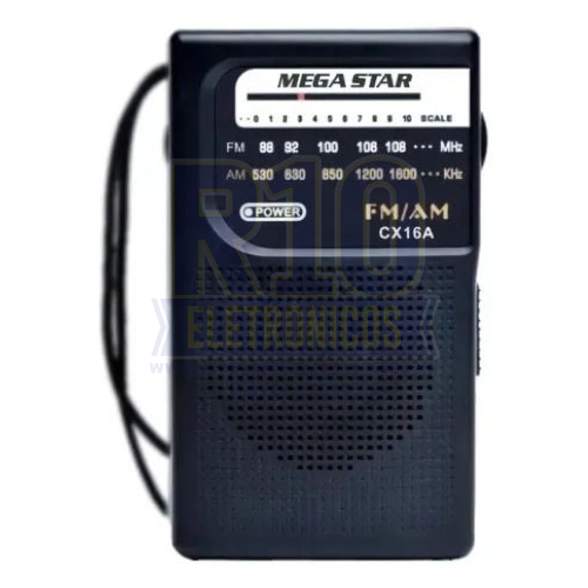 O Rádio Portátil Mega Star CX16A com alto-falante de 57 mm, está equipado com potência máxima de 0.5 para reproduzir com nitidez diferentes estilos musicais. Dispõe de antena retrátil para ampliar o alcance de busca do sinal e melhorar a estabilidade de conexão com as estações AM e FM disponíveis na região. Além disso, possui interface Mini Jack 3.5mm para conectar fones de ouvido e acompanhar as principais notícias do dia e desfrutar das emissoras de rádio favoritas com maior privacidade. É leve e possui design compacto, que permite transportá-lo a passeios ou compromissos do dia a dia sem ocupar muito espaço em bolsas ou mochilas. Está equipado com 0.5 watts de potência que proporciona sonoridade com nitidez para diferentes estilos musicais. Sintoniza estações de Rádio AM e FM, que além de reproduzir diferentes gêneros musicais, também está sempre atualizando o ouvinte com as principais notícias do dia a dia. Versátil, possui alça de pulso integrada, com a qual é possível transportar com maior facilidade, ou utilizá-la para suspendê-lo em paredes ou suportes