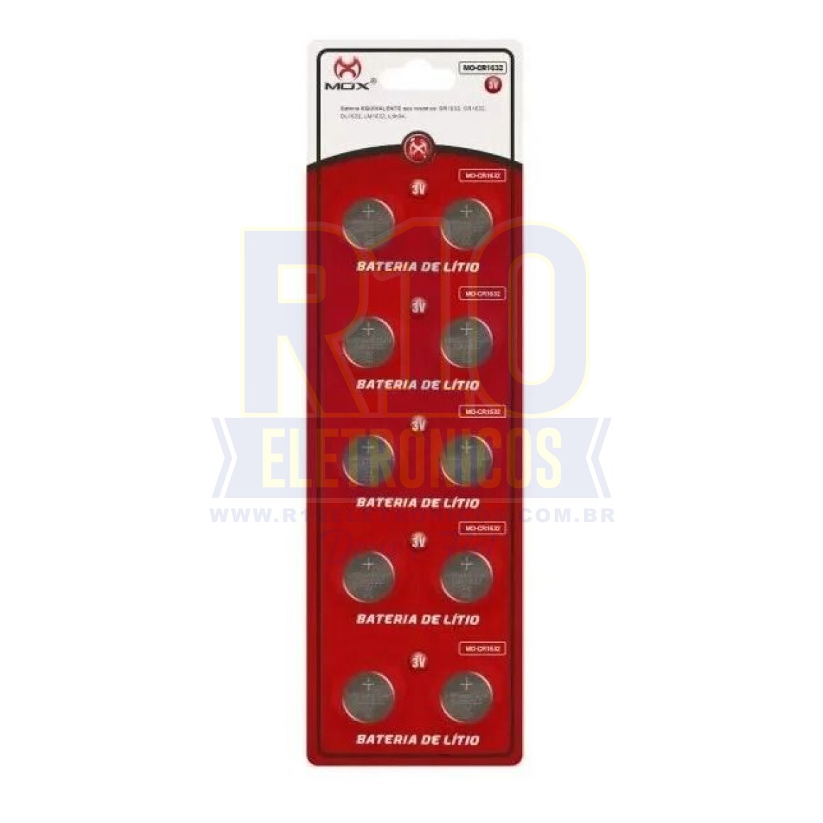 Bateria cr1632 mox 3v cartela c/10 pilhas 10 pilhas baterias cr1632 3v mox original As pilhas e baterias cr1632 mox servem para vários tipos de produtos como Bateria equivalente aos modelos : br1632, cr1632, dl1632, lm1632, ca17 e lith34 Controle de portão, calculadoras, relógios, brinquedos, timers, eletrônicos, lanternas, outros aparelhos, controles, monitor cardíaco, chave de carro, pulseira garmin, vívofit, relógios, monitor cardíaco polar, São pilhas e baterias potentes e seguras até em condições extremas de temperaturas Muito mais energia e segurança para você Informações técnicas Fabricante mox Modelo cr1632 Tamanho da pilha cr1632 Forma botão Formato de venda kit Unidades por kit 10 Voltagem 3v É recarregável não Capacidade da pilha 120 mah Fabricação indonésia Aplicação Equipamentos eletrônicos e relógios Embalagem 10 pilhas baterias cr1632 3v mox original