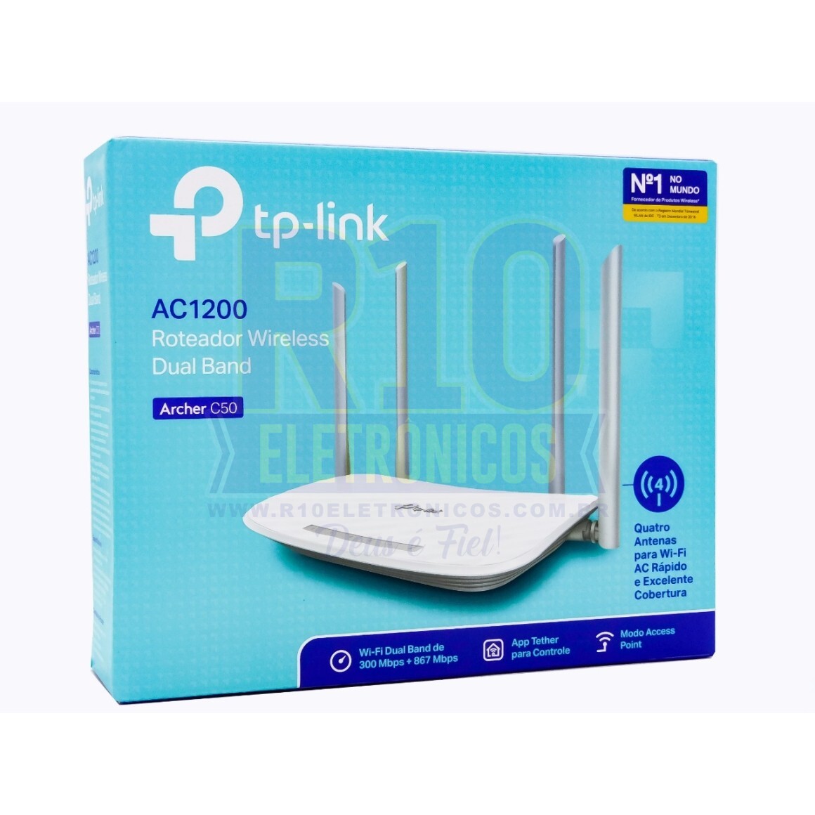 Roteador Wireless Dual Band AC1200 Archer C50 Compatível com o padrão 802.11ac - a nova geração do Wi-Fi Conexões simultâneas de 2.4GHz 300Mbps e 5GHz 867Mbps para um total de 1.2Gbps de largura de banda disponível 4 antenas externas oferecem conexões wireless estáveis e ótima cobertura Fácil gerenciamento de rede na palma da mão com o Tether da TP-Link Conexões Dual Band de 1.2Gbps para Operações e Entretenimento Livre de Lags O Archer C50 opera em ambas bandas de 2.4GHz e 5GHz, o que garante incrível desempenho wireless. Duas Bandas Simultâneas oferecem a flexibilidade de duas redes dedicadas - multiplicando várias vezes a largura de banda para as suas necessidades. Tarefas simples como o envio de e-mails ou navegação na web podem ser tratadas pela banda de 2.4 GHz, enquanto tarefas intensivas de largura de banda, como jogos online ou streaming de vídeo HD podem ser processadas pela banda de 5GHz - tudo ao mesmo tempo